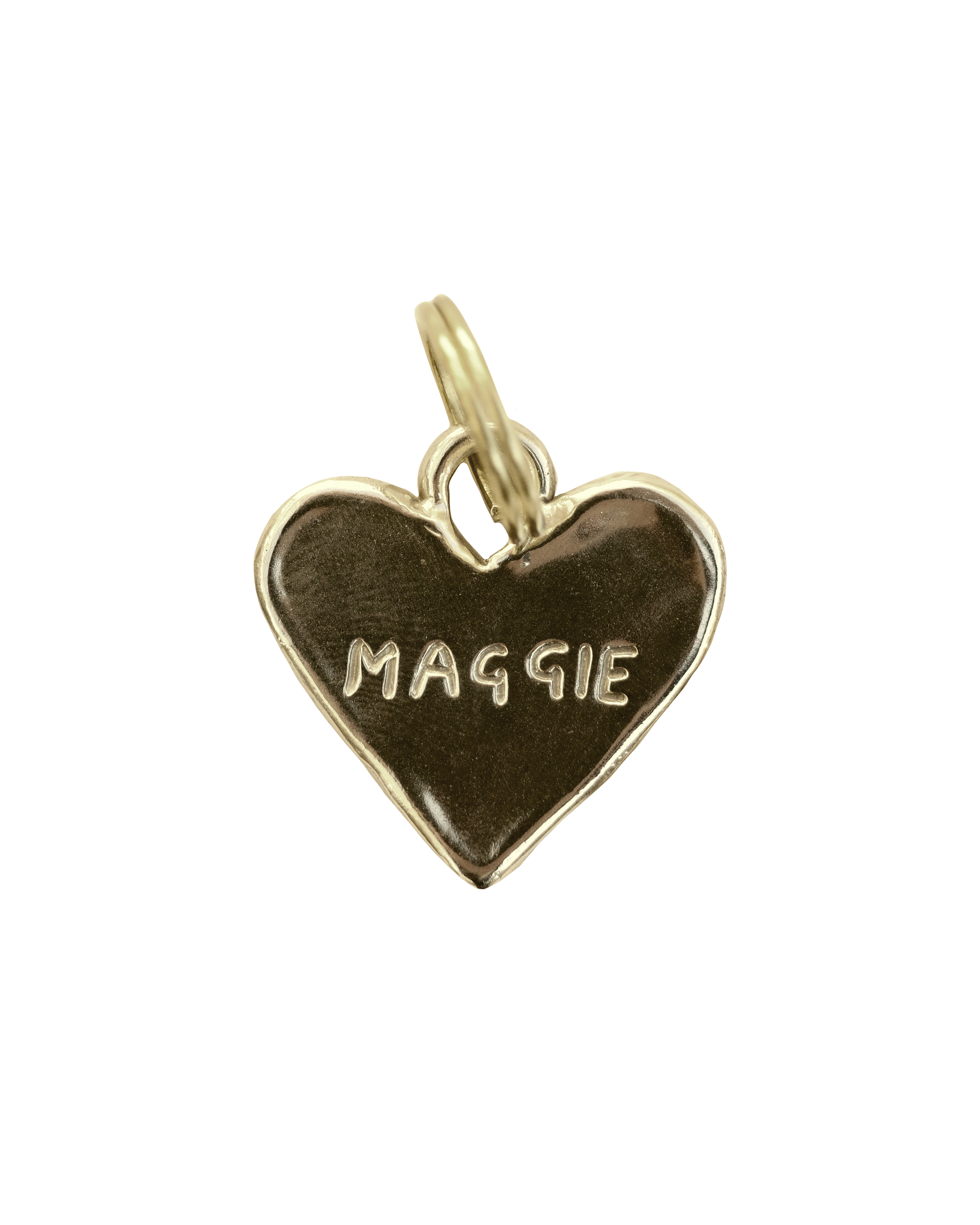 The Heart Tag is a sweet classic shape with a molten, organic twist and hand etched lettering.